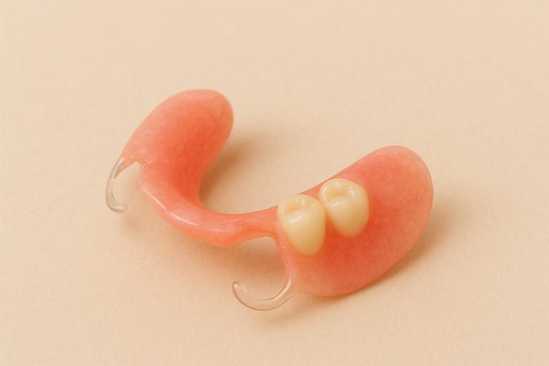 金属床義歯は、床が金属製の入れ歯です。レジンの床と比べて約3分の1の薄さで作れるため、装着時の違和感を大きく抑えられます。